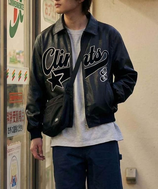 存在感のあるグラフィックプリントが目を引く、フェイクレザージップブルゾン。