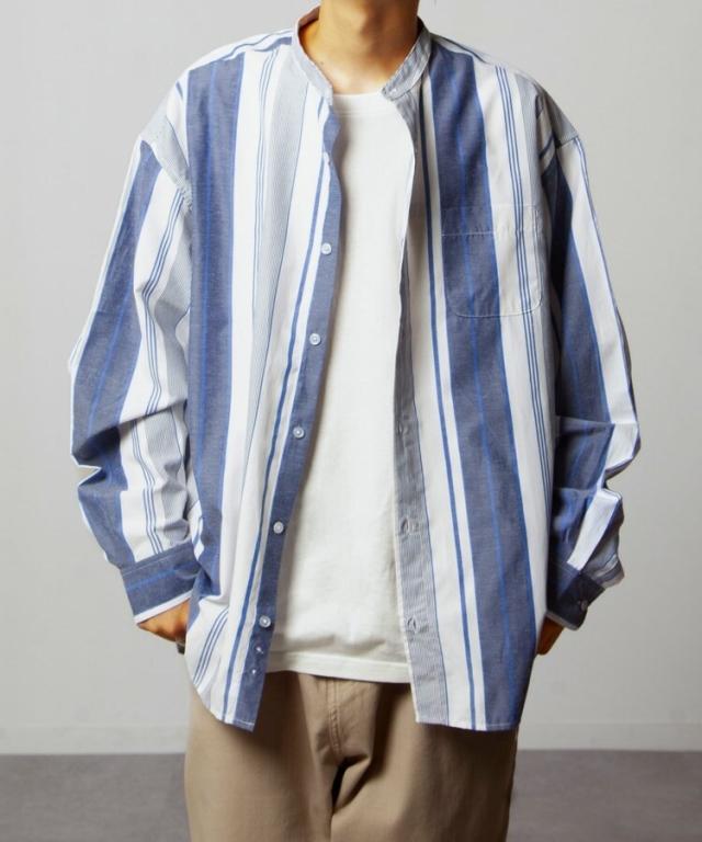 『CVCブロード 長袖 バンドカラー チェック&ストライプオーバーシャツ』