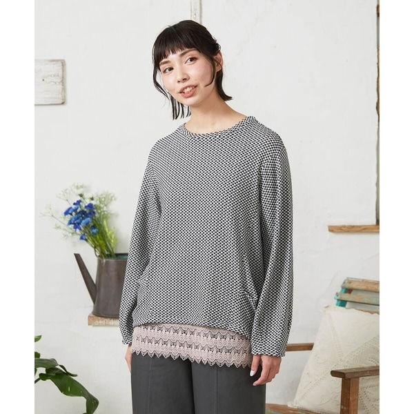 斜めに柄をとった細かなギンガムチェック柄のカットソープルオーバー。ドロップショルダーとゆとりのある身頃が着心地のよさを叶えます。やや前上がりの前後差のあるアーチ型の丈と、サイド切り替えにタックを施した変形シルエットがデザインポイントに。袖口にもタックを入れ女性らしい丸みをプラスしました。生地の落ち感と相まって、他と被らないかわいいシルエットのカットソーです。