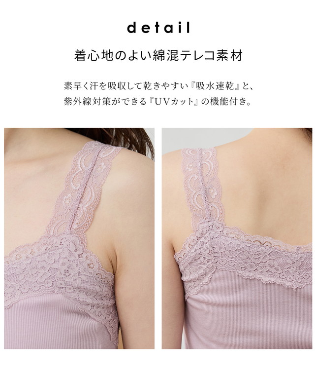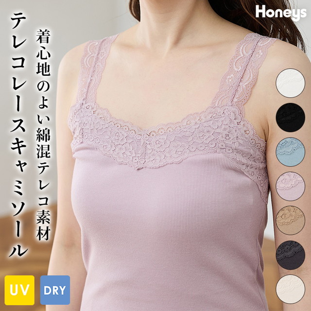 トップス キャミソール UVカット 吸水速乾 レース ストレッチ テレコ素材 綿混 無地 フェミニン レディース Honeys ハニーズ テレコレースキャミソール