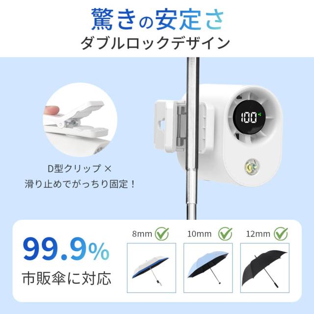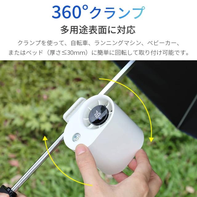 本体にはD型クリップと滑り止めが搭載されており、ダブルロック設計で驚くほどしっかり固定可能。クランプは360度回転に対応しており、自転車、ランニングマシン、ベビーカー、ベッド(厚さ30mm以内)など、様々な場所に自由自在に取り付け可能。さらに、市販されている99.9%の日傘のシャフト径にも対応しているので、夏のお出かけにも安心して使えます。