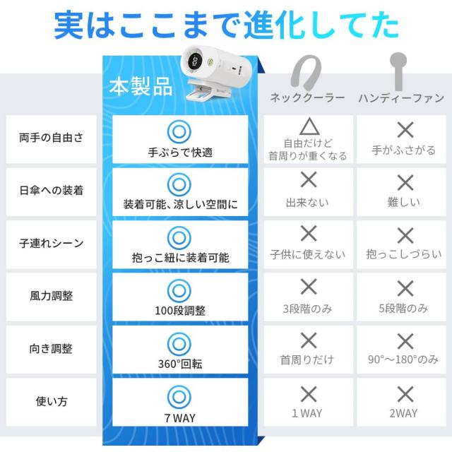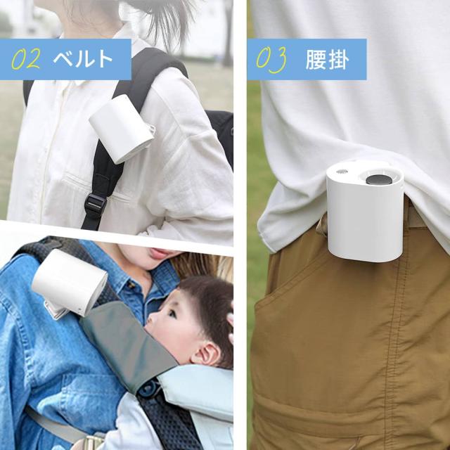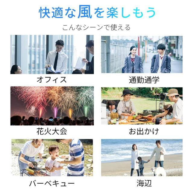 日傘に装着可能なクリップ式をはじめ、首にかけて使えるネックストラップ、腰のベルトに取り付け可能なベルト対応、机に置ける卓上使用、持ち歩きできる手持ちスタイル、腰に掛けて使える腰掛け、さらには壁に掛けての壁掛け使用まで、合計7通りの使い方に対応。屋内外問わず、通勤・通学・お祭り・アウトドアなどあらゆるシーンで、あなたにピッタリのスタイルで快適な風をお届けします。