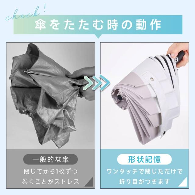 形状記憶加工により、閉じた瞬間に傘面が自動で整い、たたむ時間と手間を大幅に削減。