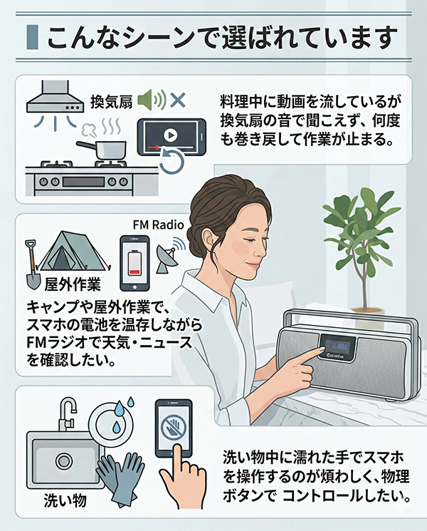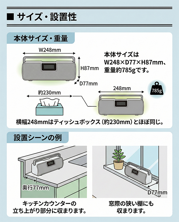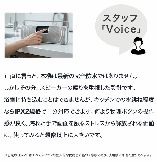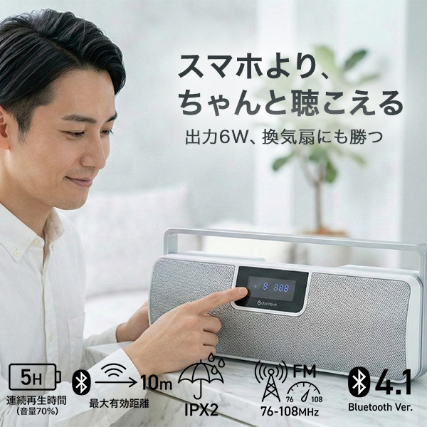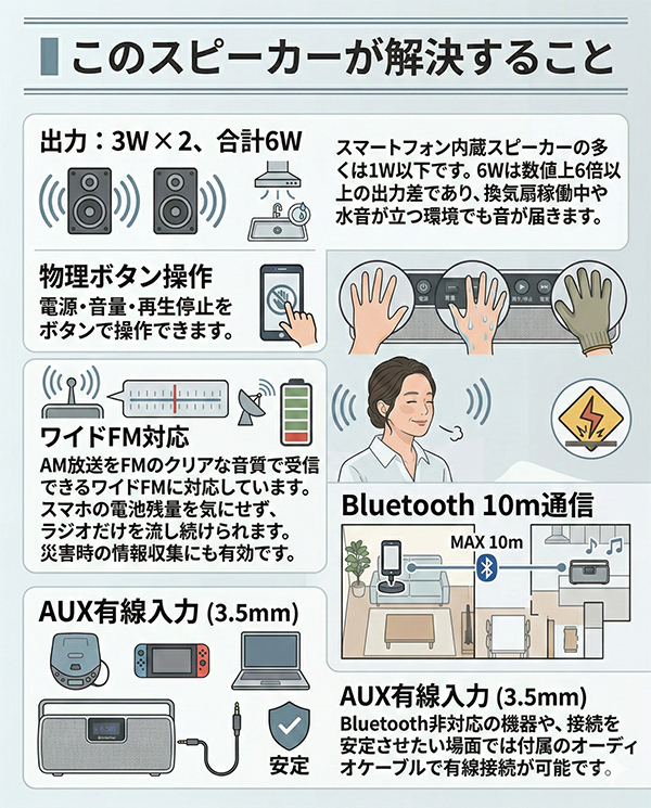 換気扇や水仕事の騒音に、スマホのスピーカーはかき消される。 合計6Wの出力と物理ボタン操作で、その問題を解消します。 ━━━━━━━━━━━━━━━━ ■ こんなシーンで選ばれています ━━━━━━━━━━━━━━━━ 料理中に動画を流しているが換気扇の音で聞こえず、何度も巻き戻して作業が止まる。 キャンプや屋外作業で、スマホの電池を温存しながらFMラジオで天気・ニュースを確認したい。 洗い物中に濡れた手でスマホを操作するのが煩わしく、物理ボタンで手元コントロールしたい。 ━━━━━━━━━━━━━━━━ ■ このスピーカーが解決すること ━━━━━━━━━━━━━━━━ ・出力:3W × 2、合計6W スマートフォン内蔵スピーカーの多くは1W以下です。6Wは数値上6倍以上の出力差であり、換気扇稼働中や水音が立つ環境でも音が届きます。 ・物理ボタン操作 電源・音量・再生停止をボタンで操作できます。濡れた手や作業用手袋をしたままでも、画面タッチ不要で操作が完結します。 ・ワイドFM対応 AM放送をFMのクリアな音質で受信できるワイドFMに対応しています。スマホの電池残量を気にせず、ラジオだけを流し続けられます。災害時の情報収集にも有効です。 ・Bluetooth 10m通信 障害物がない環境で最大10mの通信距離があります。リビングでスマホを充電したままキッチンで音楽を流す、といった使い方が可能です。 ・AUX有線入力(3.5mm) Bluetooth非対応の機器や、接続を安定させたい場面では付属のオーディオケーブルで有線接続が可能です。 ━━━━━━━━━━━━━━━━ ■ サイズ・設置性 ━━━━━━━━━━━━━━━━ 本体サイズはW248 × D77 × H87mm、重量約785gです。 横幅248mmはティッシュボックス(約230mm)とほぼ同じ。 奥行77mmはキッチンカウンターの立ち上がり部分や窓際の狭い棚にも収まります。 ━━━━━━━━━━━━━━━━ ■ スタッフの声 ━━━━━━━━━━━━━━━━ 正直に言うと、本機は最新の完全防水ではありません。しかしその分、スピーカーの鳴りを重視した設計です。 浴室に持ち込むことはできませんが、キッチンでの水跳ね程度ならIPX2規格で十分対応できます。 何より物理ボタンの操作感が良く、濡れた手で画面を触るストレスから解放される価値は、使ってみると想像以上に大きいです。 ※コメントは実際の使用感に基づくスタッフ個人の感想です。 ━━━━━━━━━━━━━━━━ ■ 購入前の確認事項 ━━━━━━━━━━━━━━━━ ・防水性能について 本製品はIPX2相当の防滴仕様です。垂直から15度以内の水滴には耐えますが、シャワーの直接噴霧・水没・浴室内での使用には対応していません。水回りでは蛇口から離して設置してください。 ・連続再生時間について 約5時間は音量70%時の目安です。最大音量での使用は連続再生時間が短くなります。長時間使用する場合は付属のACアダプターでの給電を推奨します。 ・Bluetooth通信距離について 10mは障害物がない場合の目安です。壁・扉・家電製品の干渉により短くなる場合があります。 ・付属品について セット内容はACアダプター・オーディオケーブル・説明書です。スピーカースタンド・壁掛け金具は付属しません。 ━━━━━━━━━━━━━━━━ ■ よくあるご質問 ━━━━━━━━━━━━━━━━ Q. ワイドFMとは何ですか? A. AM放送をFM波で送信するサービスで、AMより雑音が少なくクリアに聴けます。災害時にも比較的受信しやすい特性があります。 Q. iPhoneとAndroid、どちらでも使えますか? A. 標準的なBluetooth規格に対応していますので、iPhone・Android・タブレットいずれも接続できます。 Q. Bluetooth接続しながらFMラジオは聴けますか? A. FMラジオ使用時はBluetooth接続を切り替える必要があります。同時併用はできません。 Q. 電源はコンセントのみですか? A. 内蔵バッテリーで使用できます。ACアダプター給電中も使用可能です。 ━━━━━━━━━━━━━━━━ ■ 最後に ━━━━━━━━━━━━━━━━ 音が聞こえないたびに手を止めてスマホを操作する。その数秒が、1ヶ月で数時間の無駄になります。 本製品を置くだけで、キッチンは自分だけの視聴空間に変わります。 義務的な家事時間を、待ち遠しい自分の時間へ。その変化を、今日から始めてください。 ━━━━━━━━━━━━━━━━ ■ 製品スペック ━━━━━━━━━━━━━━━━