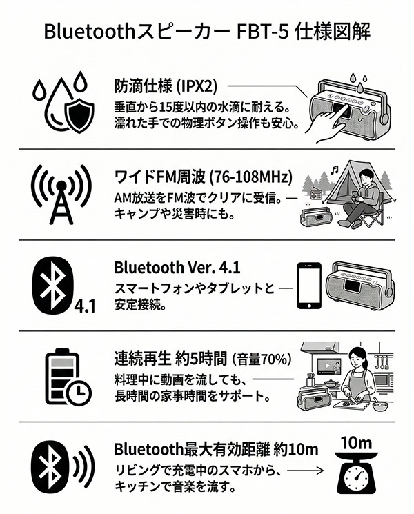 ポータブルスピーカー Bluetooth ワイドFM対応 防滴 IPX2 6W出力 有線接続 AUX 3.5mm 台所 作業場 コンパクト FBT-5
