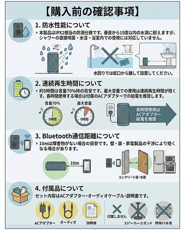 ━━━━━━━━━━━━━━━━ ■ 共通仕様・注意事項 ━━━━━━━━━━━━━━━━ ・セット内容:本体、ACアダプター、オーディオケーブル(3.5mm)、説明書、保証書 ・防水について:IPX2は防滴規格です。完全防水ではありません。水中・シャワー直噴での使用は故障の原因になります。 ・Bluetooth:障害物・電波干渉により通信距離は変動します。 ・バッテリー:連続再生時間は使用音量・環境により変動します。 |
