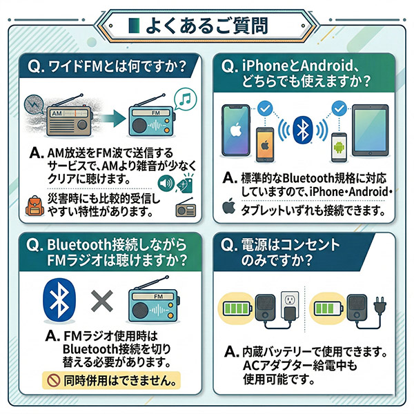 AM放送をFMのクリアな音質で受信できるワイドFMに対応しています。スマホの電池残量を気にせず、ラジオだけを流し続けられます。災害時の情報収集にも有効です。