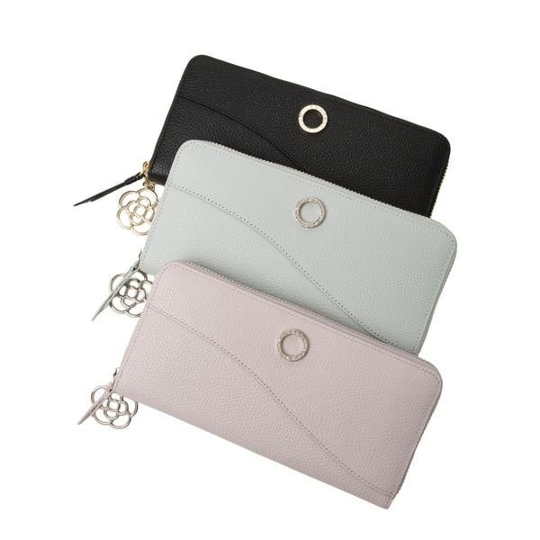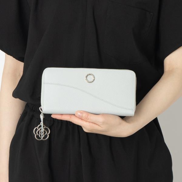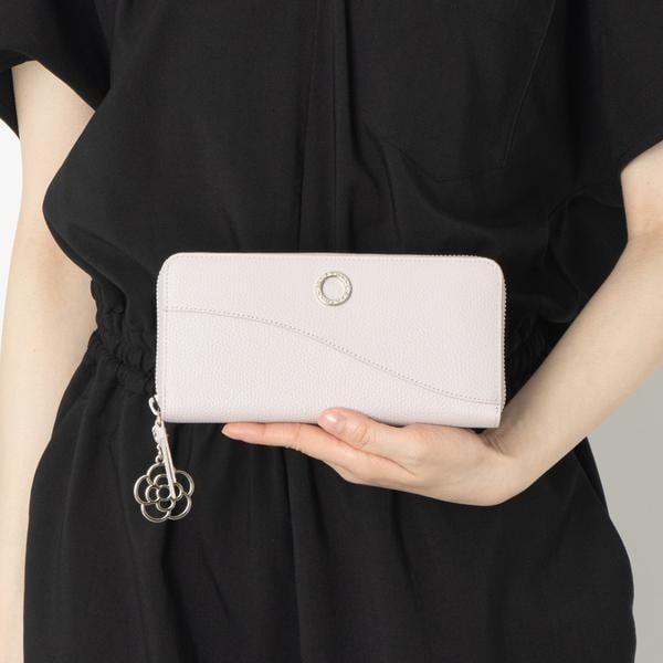 夏らしい軽やかなカラーバリエーションと、ラメがきらめく柔らかなシュリンクレザーが魅力の「カーラ」シリーズ。上品さの中に爽やかな華やぎを感じさせる大人のためのウォレットです。手に吸い付くような質感と使い込むほどになじむ心地よさを実現。シルバーカラーの金具が全体を軽やかに引き締め、洗練された印象をプラスしています。取り外し可能なカメリアチャーム付きで、気分やシーンに合わせて表情を変えられるのも嬉しいポイント。収納力とデザイン性を兼ね備えた、日常からお出かけまで活躍するお財布です。【メーカーサイズ寸法(実寸)】サイズ:H:10/W:19.5/D:2/チャーム(取外し可能):5.5cm/重さ:200g/側面フリーポケット:1/内装札入:3/内装ファスナ−小銭入れ仕切り有:2/内装カードスロット:22/フリーポケット:2