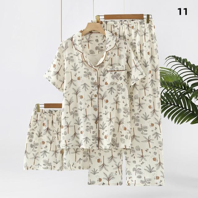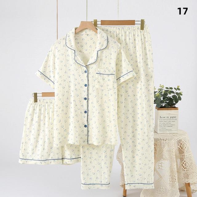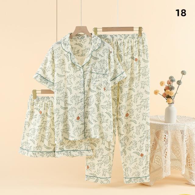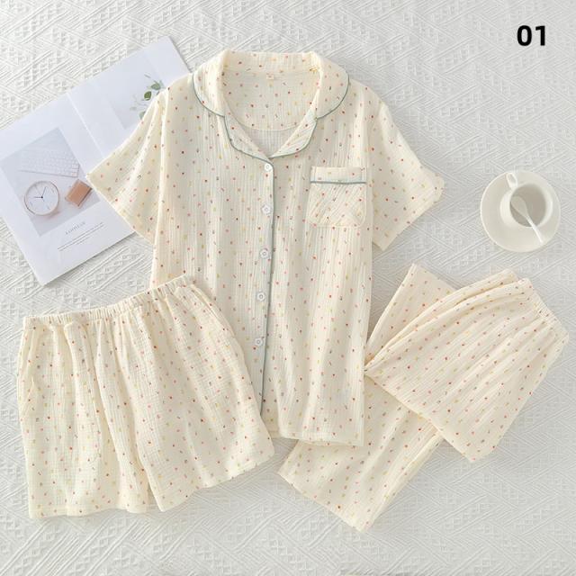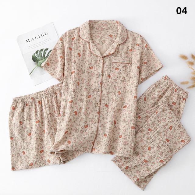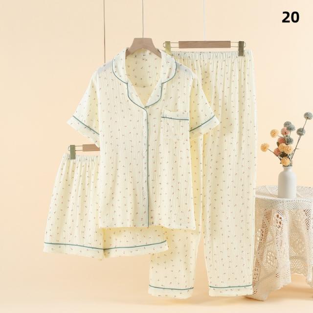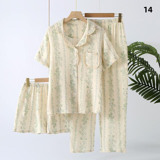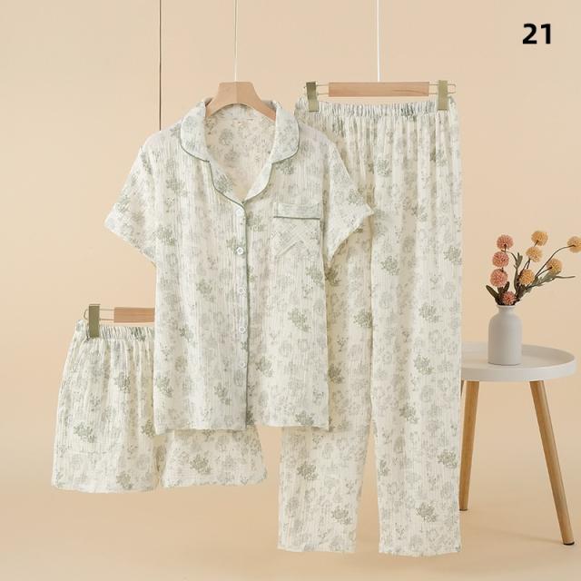 3点セット パジャマ レディース 前開き 上下セット 花柄 小花 半袖 ロングパンツ ショートパンツ 綿100% ダブルガーゼ風 薄手 ルームウェア ナイトウェア 部屋着 夏 春 秋 女性用