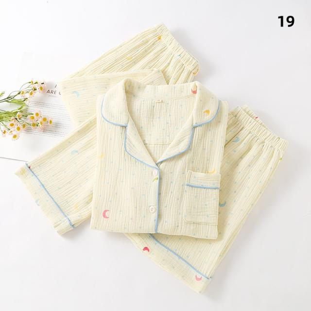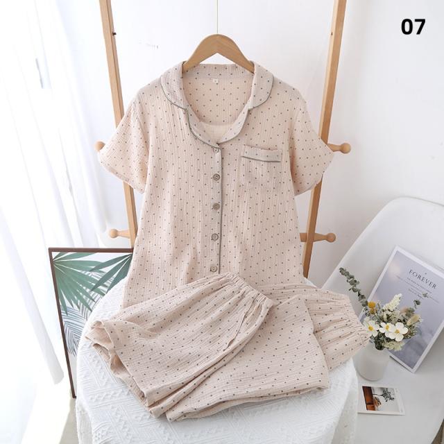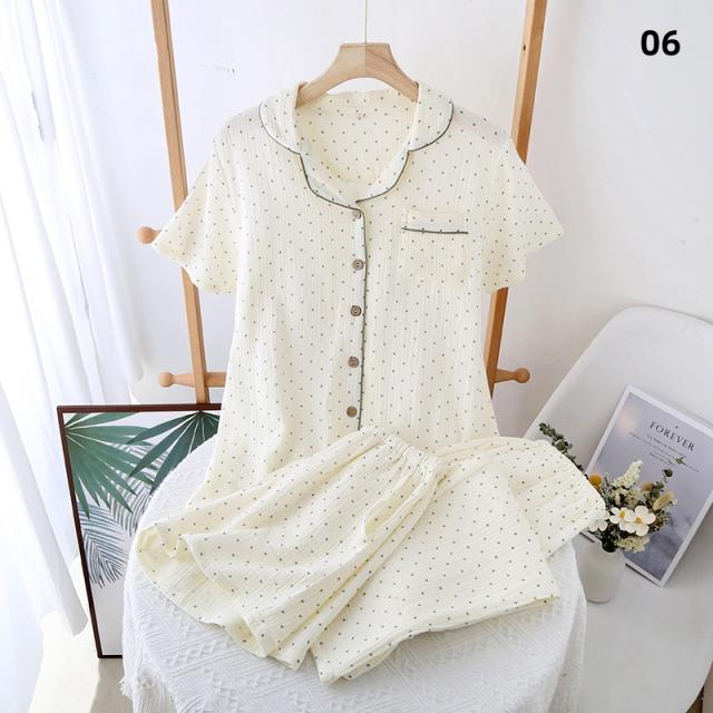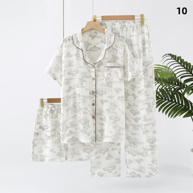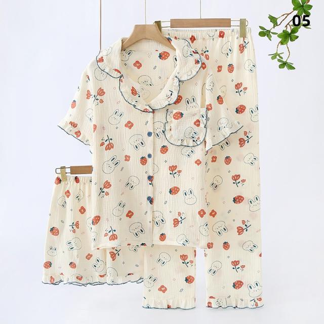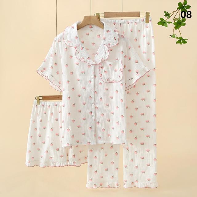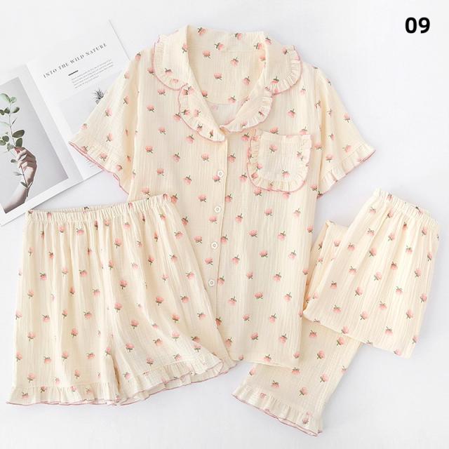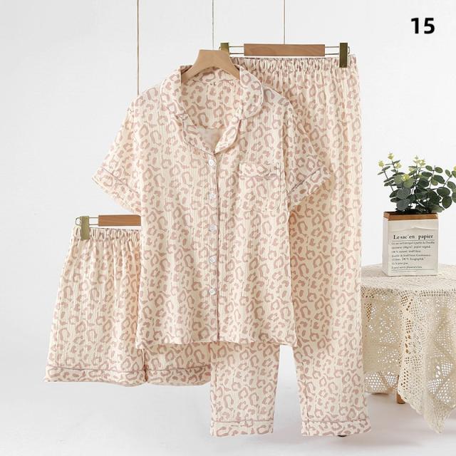 3点セット パジャマ レディース 前開き 上下セット 花柄 小花 半袖 ロングパンツ ショートパンツ 綿100% ダブルガーゼ風 薄手 ルームウェア ナイトウェア 部屋着 夏 春 秋 女性用