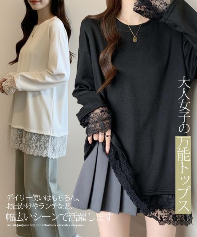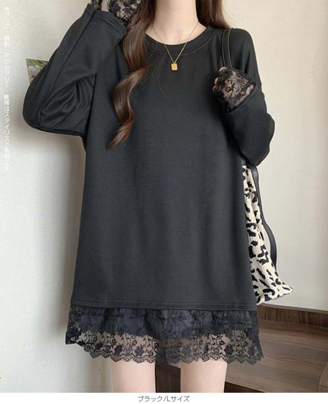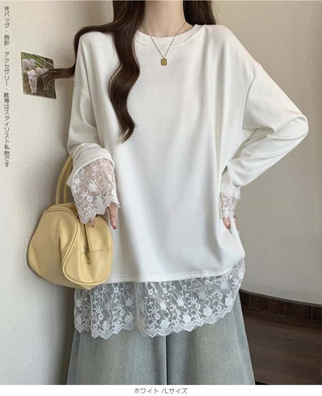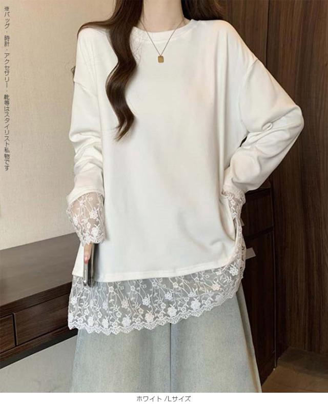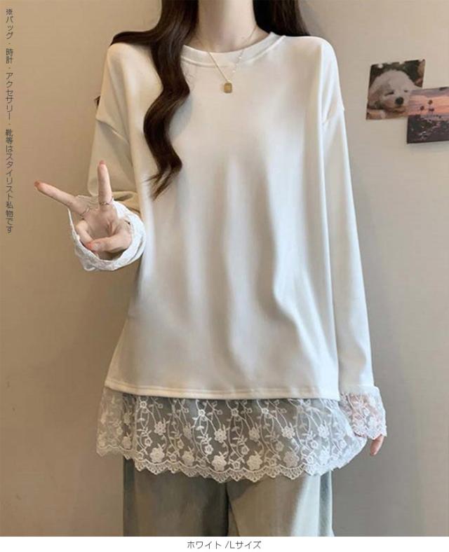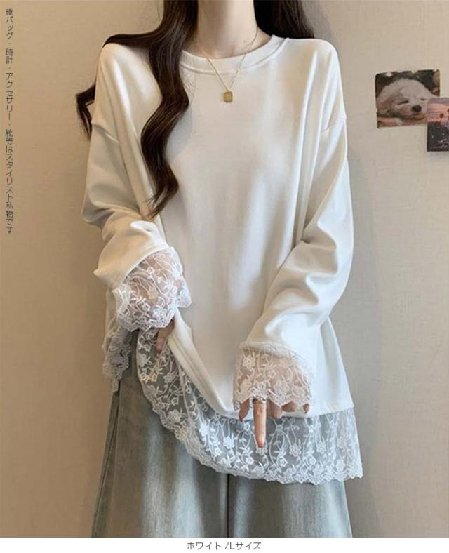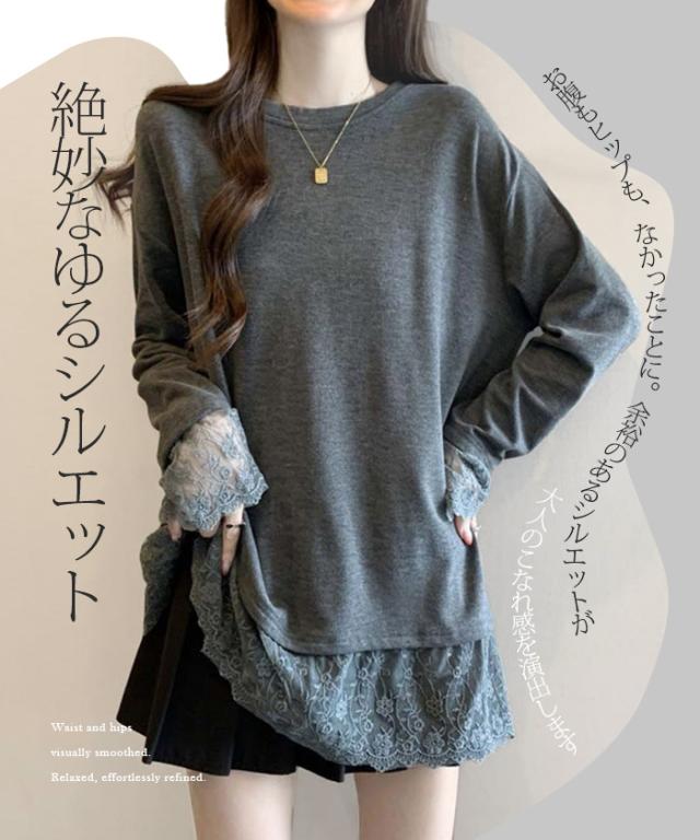33%OFFクーポン!レディース 春 ゆるシルエット 長袖 Tシャツ ぽっちゃり 華奢見え トップス レース 切替 ロンT 体型カバー 2L 3L 4L 大きいサイズ 大人可愛い レース切替 ゆるロン 異素材ミックス チュニック こなれ感【 レース切替ロンT 】