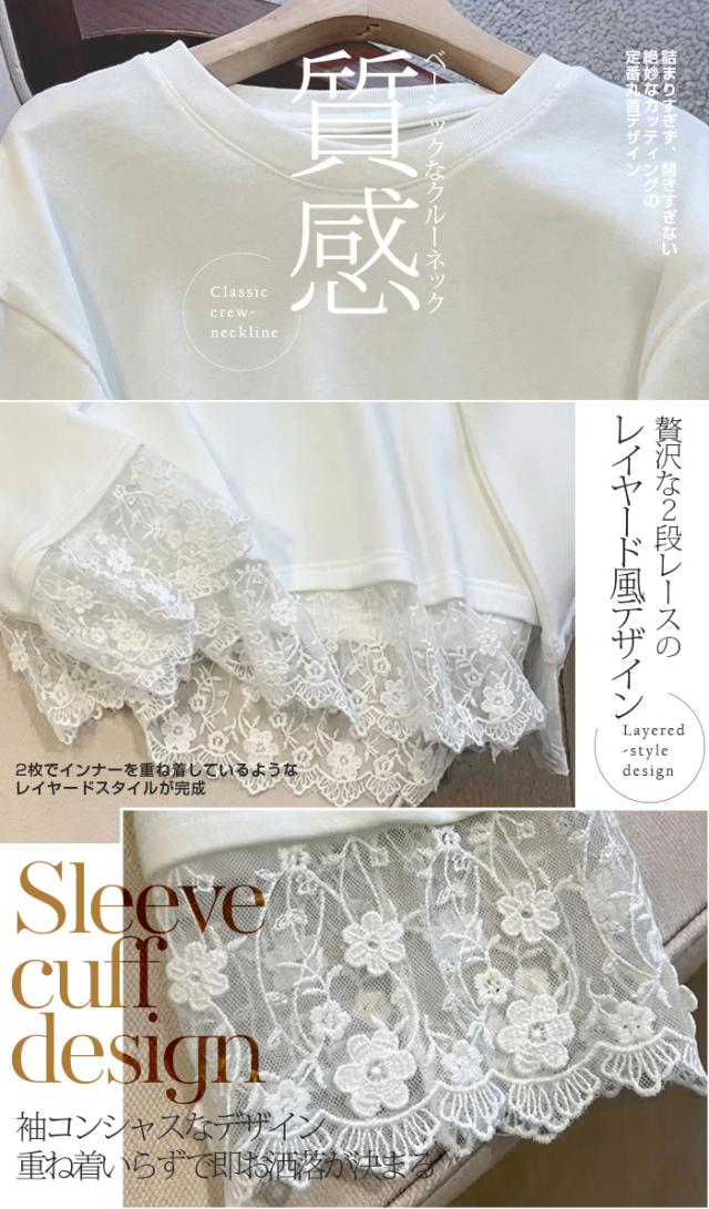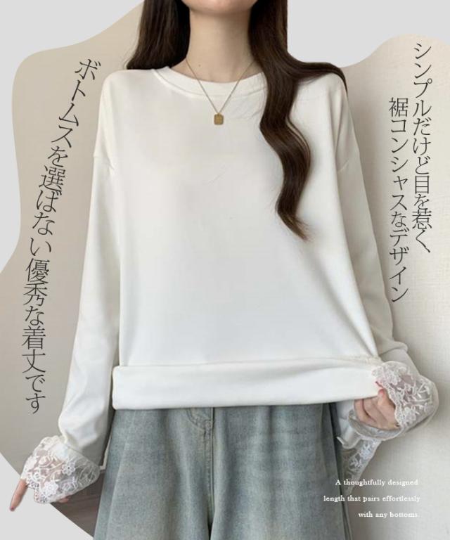 大人可愛いレース使い:袖口に施された繊細なレースが、