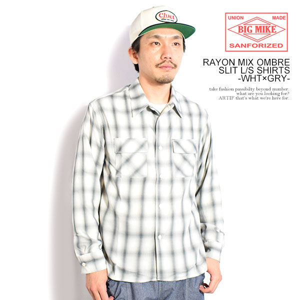 BIG MIKE ビッグマイク RAYON MIX OMBRE SLIT L/S SHIRTS -WHT×GRY- メンズ シャツ 長袖 チェックシャツ レーヨンシャツ atftps