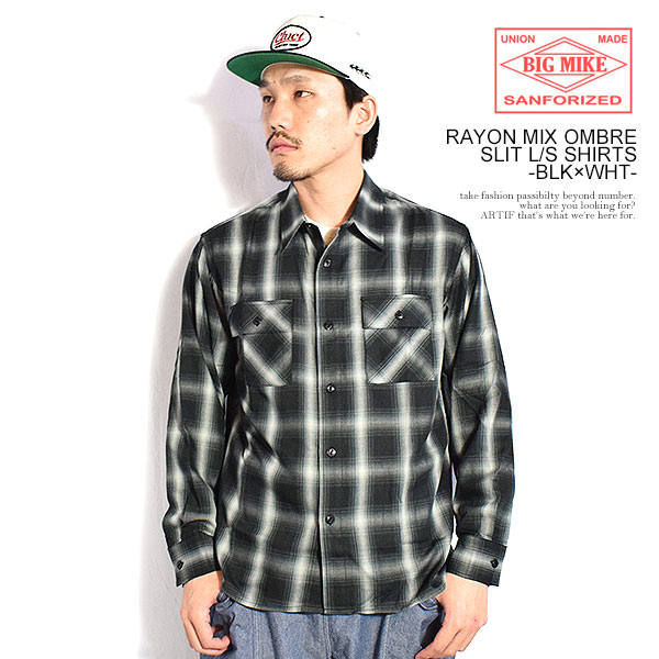 BIG MIKE ビッグマイク RAYON MIX OMBRE SLIT L/S SHIRTS -BLK×WHT- メンズ シャツ 長袖 チェックシャツ レーヨンシャツ atftps