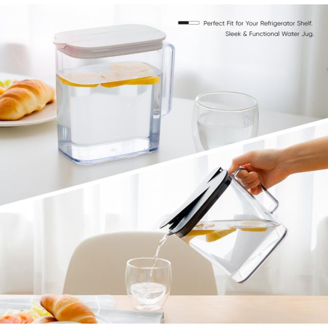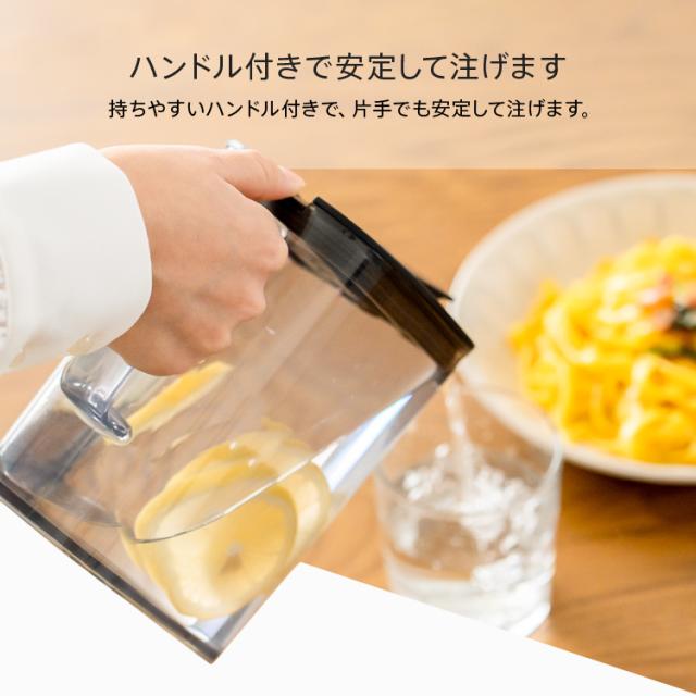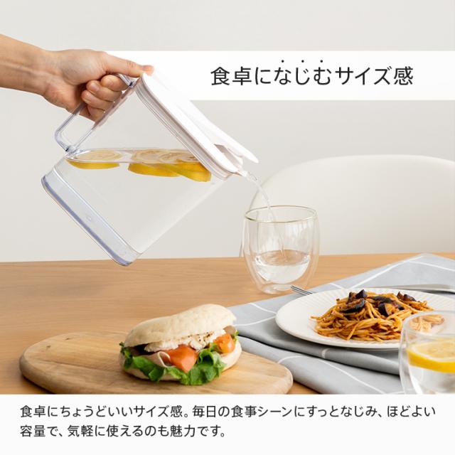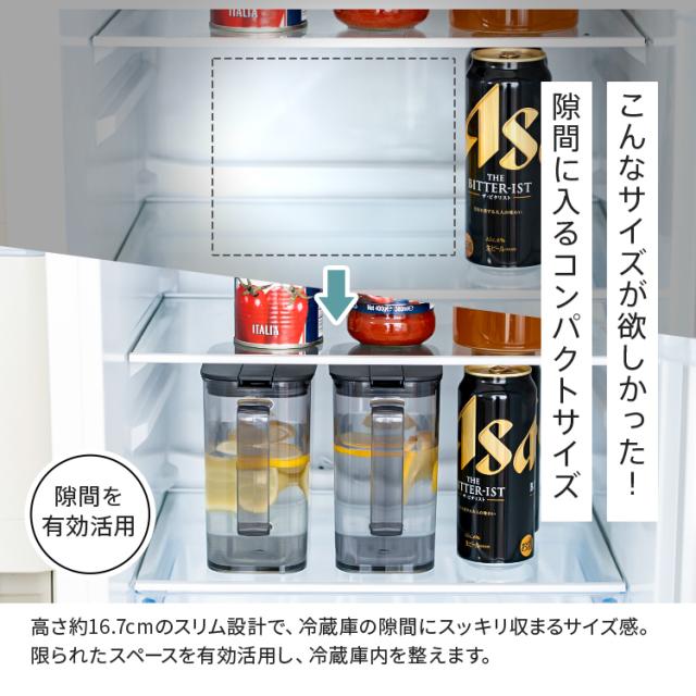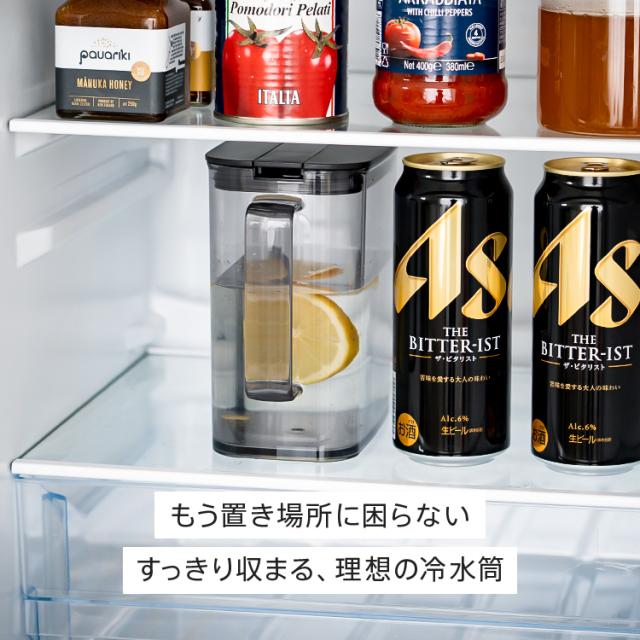500ml缶と同じ高さで冷蔵庫の棚のすきまにぴったり収まるピッチャー登場!前ドアポケットにも収まるコンパクト形状。テーブル上にもぴったりのサイズ感です♪ハンドル付きワンプッシュで操作できるので簡単に開閉。食洗機対応、部品も少ないのでお手入れも簡単です!耐熱仕様で、麦茶などの煮出しも可能。