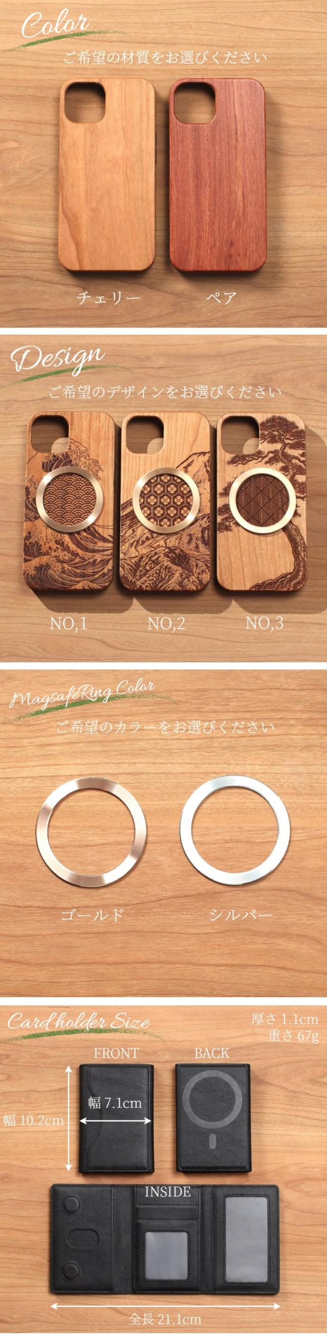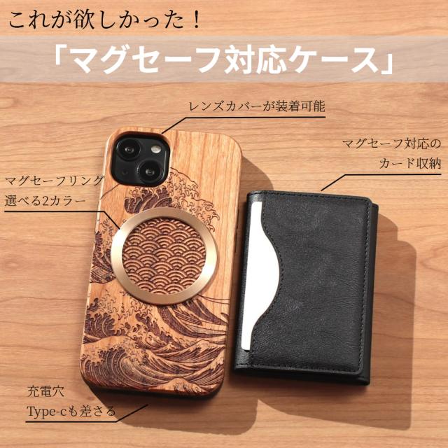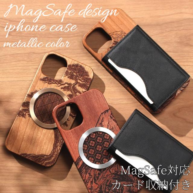 iphone ケース カード収納付き 木製 iphone17 iphone16 iphone15 iphone14 MagSafe マグセーフ 背面収納 カード アイフォン 17 16 15 14 13 12 SE 天然木 ウッド magsafe対応 マグセーフ対応 両面開き 財布 17pro 16pro 13mini se3 マグネット 和柄 文様 メタリック 送料無料