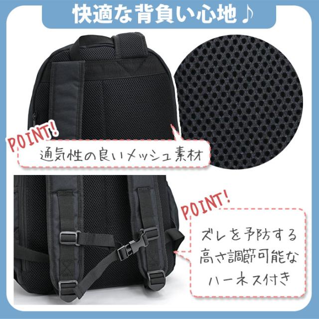 背面は通気性の良いメッシュ素材で、長時間の使用も快適。高さ調節可能なハーネス付きでフィット感も抜群です。
