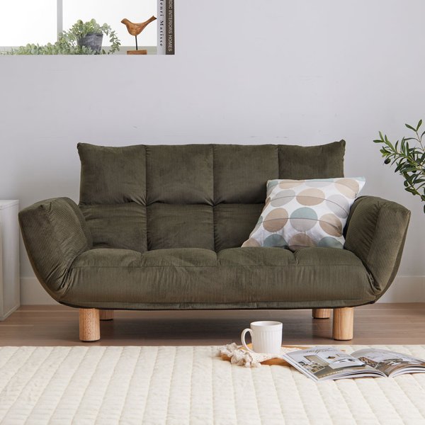 ふかふかな肌触りのカーキ色コーデュロイ素材を使用した、肘付きでコンパクトなリクライニング可能なフロアソファ ローソファ 低い フロアタイプ ロータイプ フロアソファ としても使える、脚付きの快適なソファ ふかふか カウチソファ コーデュロイカーキ 肘付 コンパクト 脚付 リクライニング フロアソファ ローソファ 低い フロアタイプ ロータイプ フロアソファ LIRAKU