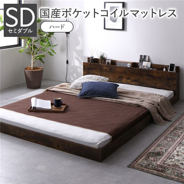 セミダブルベッド ベッド 国産 日本製 国産ポケットコイルマットレス付 ハード ヴィンテージブラウン 低床 すのこ コンセント 宮付 ローベッド 送料無料
