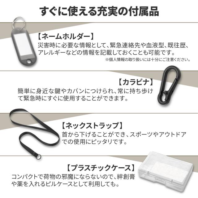ネックストラップ・カラビナ・ネームホルダー・専用ケースを標準装備。ネームホルダーには緊急連絡先や血液型なども記入可能です。