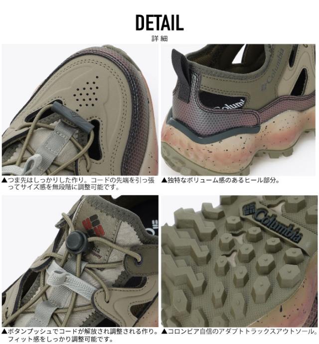 サンダルらしい爽やかなルックスに、波打つような肉厚ソールが特徴的なコロンビア最高峰のミッドソールテクノロジーと、トレイルシューズから着想を得た安定感のあるグリップ力を誇るアウトソールを備えたハイスペックな一足。さらに、シューレースには、ワンアクションでフィッティングできるスピードレースを採用するなど、細かなギミックにも注目。素足や靴下を使ったレイヤードスタイルと、自由自在にコーディネートを楽しめます。