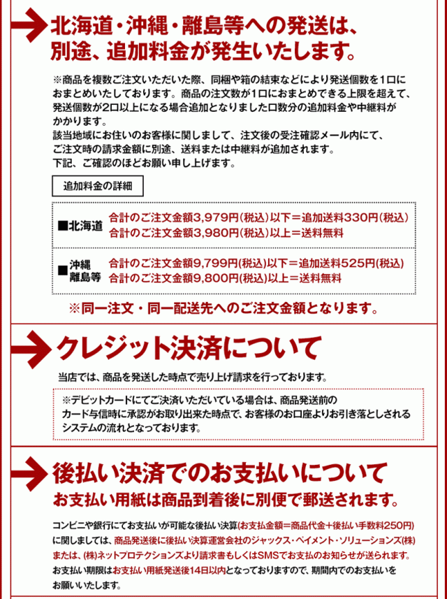 | 不正注文時のキャンセルについて | 不正購入と判断した場合にはご注文を取り消しさせて頂く可能性がございます。 |