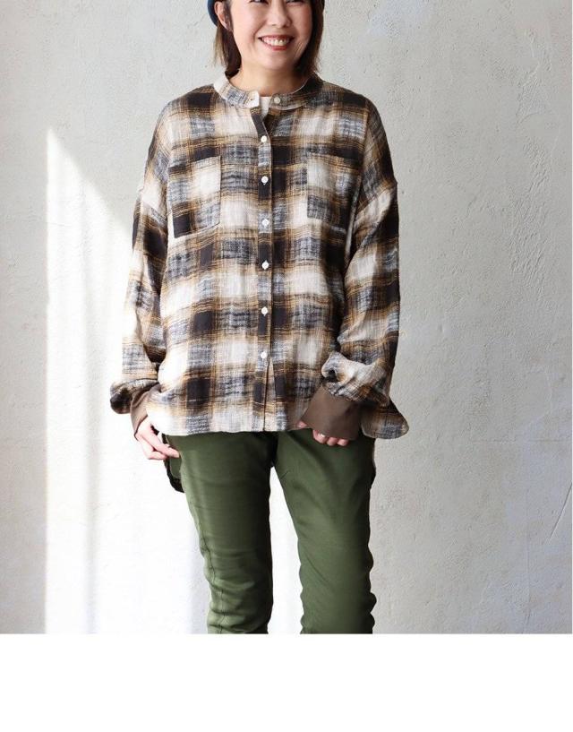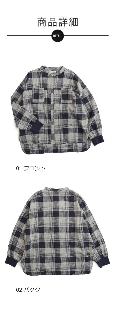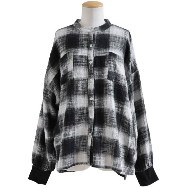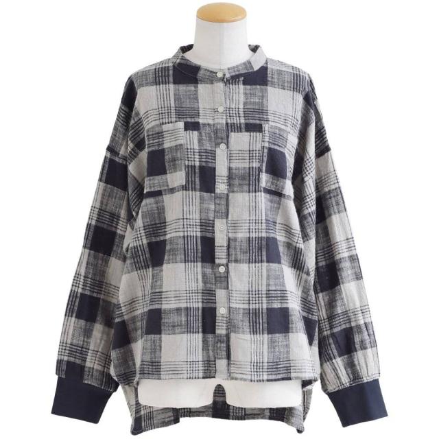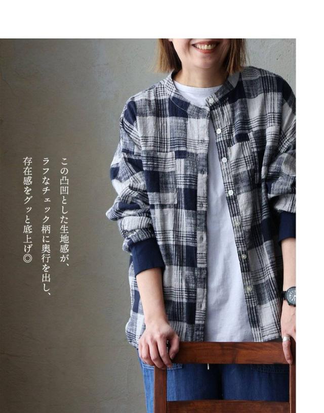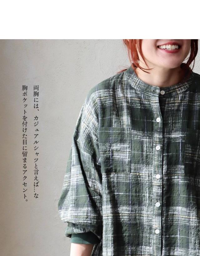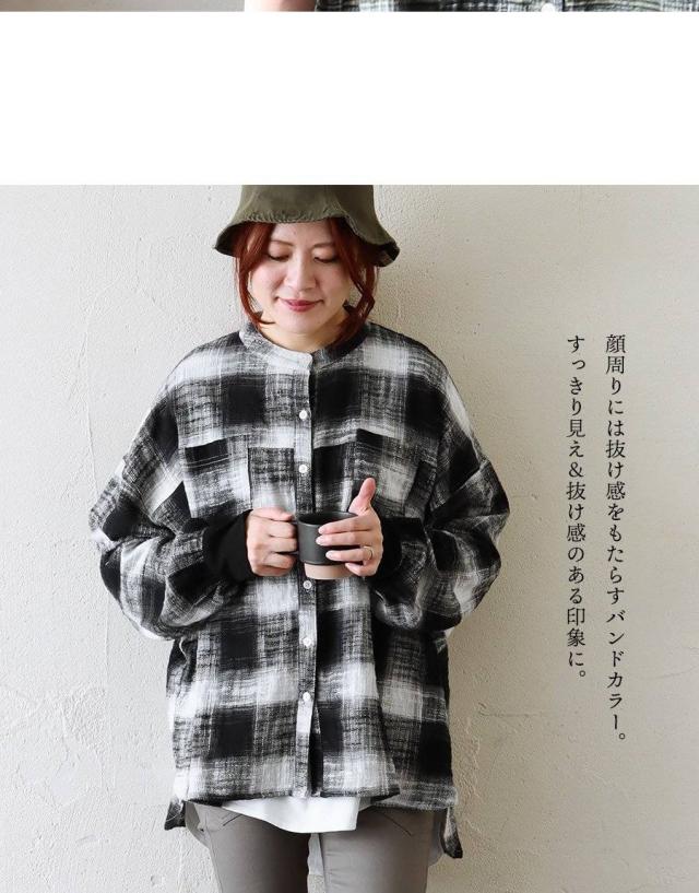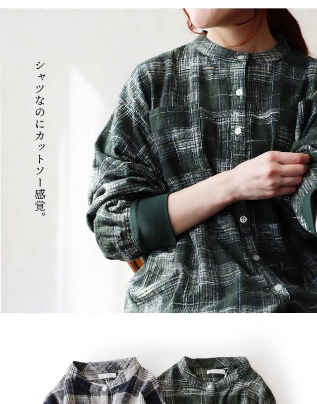 シャツ 長袖 レディース 袖リブ すっきり 着痩せ バンドカラー チェック柄 マドラスチェック 綿100 コットン スラブ 薄手 軽い 伸縮性 ゆったり 大きいサイズ 体型カバー 春 カジュアル パティ