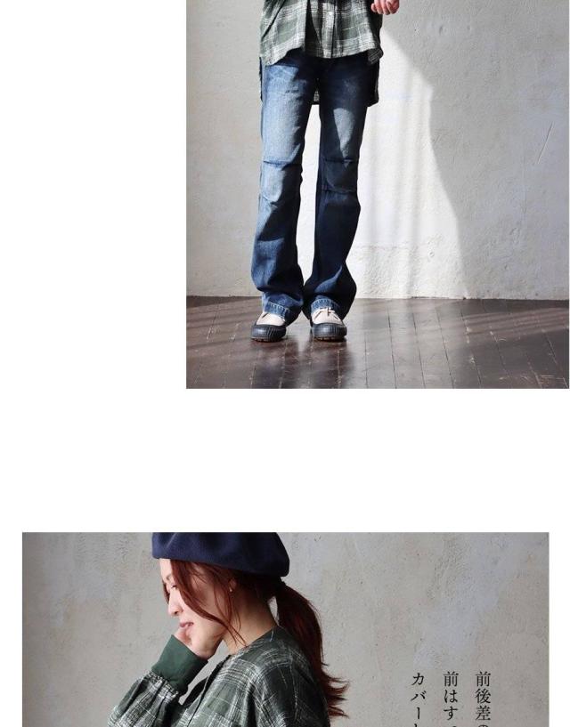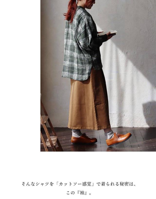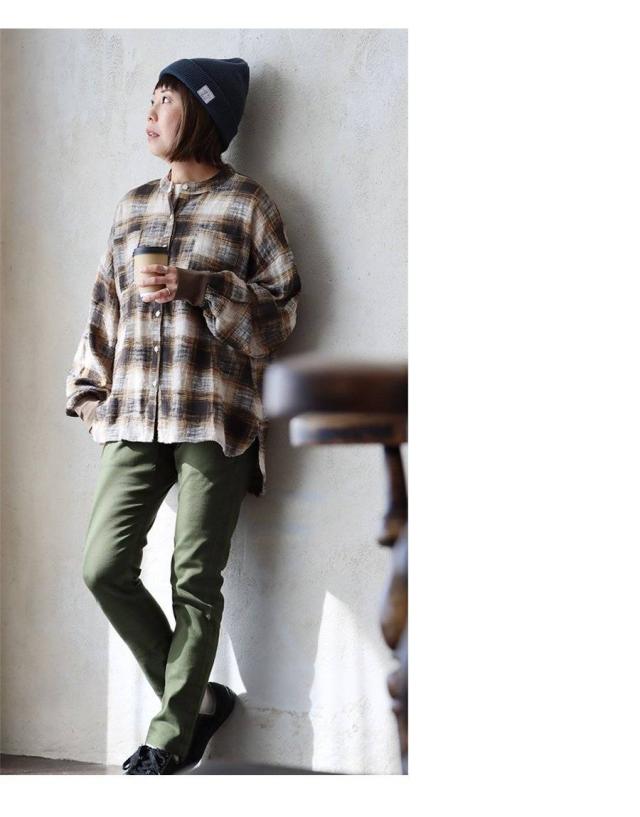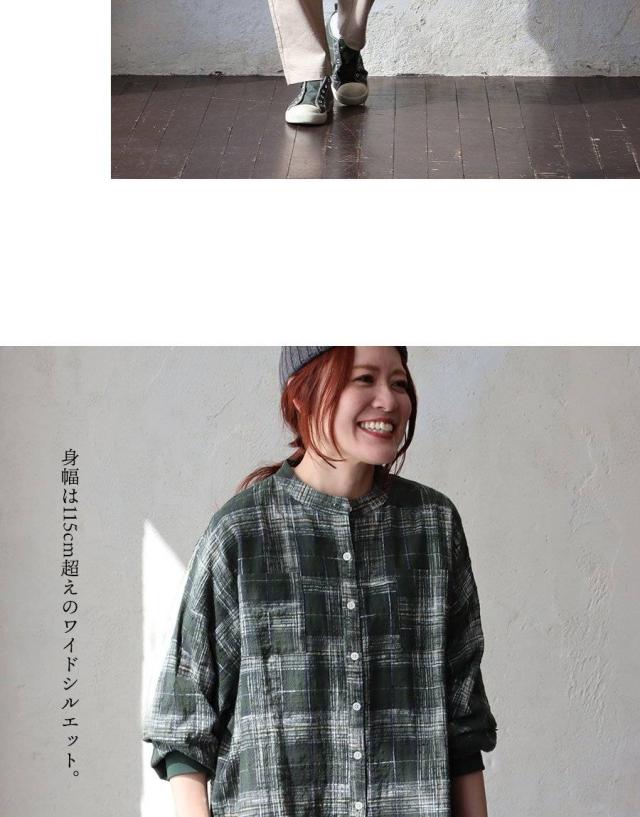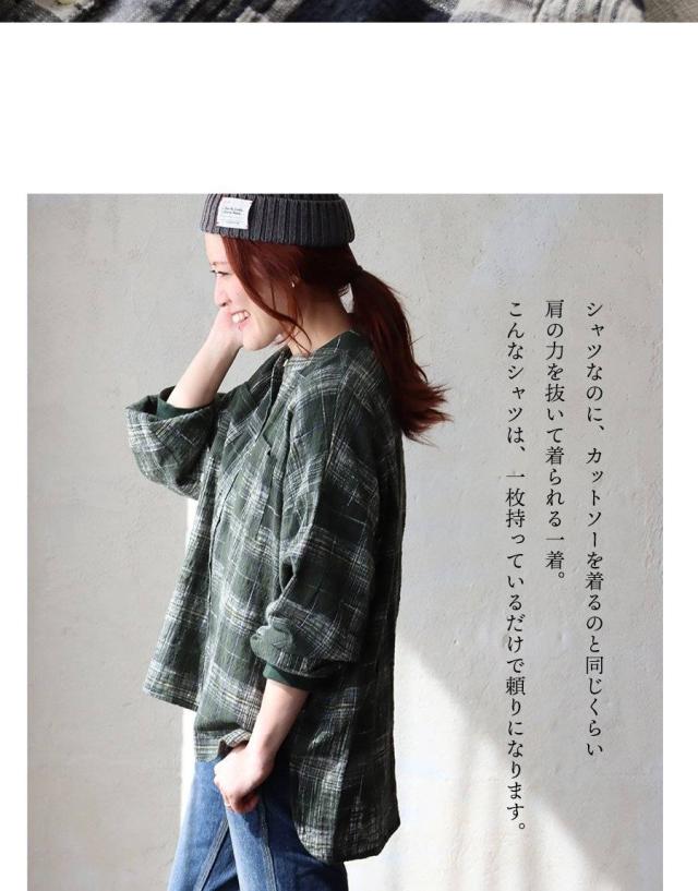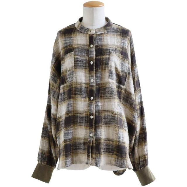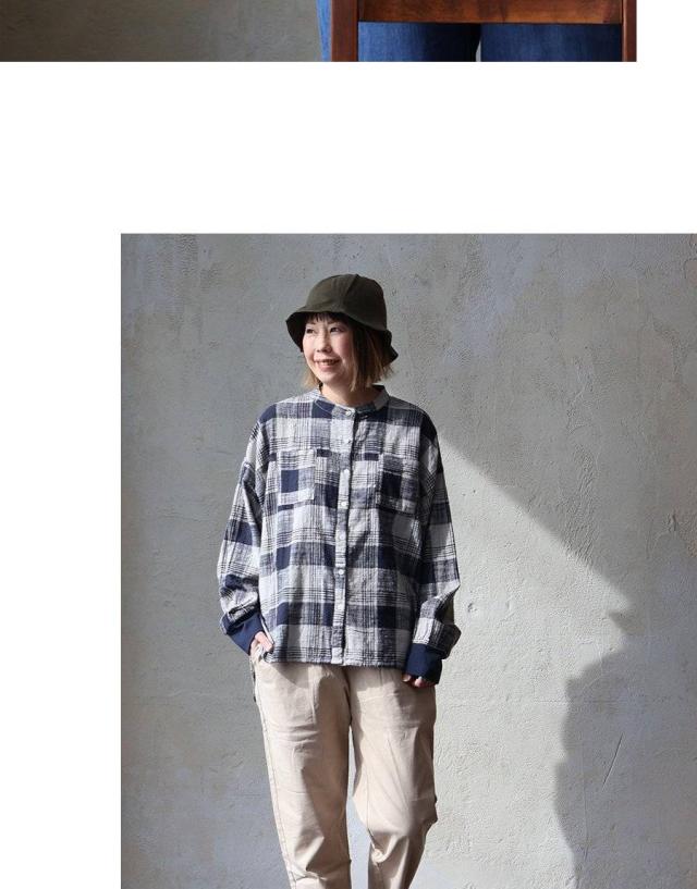 シャツ 長袖 レディース 袖リブ すっきり 着痩せ バンドカラー チェック柄 マドラスチェック 綿100 コットン スラブ 薄手 軽い 伸縮性 ゆったり 大きいサイズ 体型カバー 春 カジュアル パティ