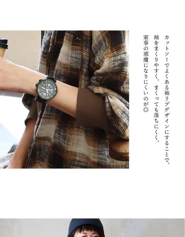 ・カットソーでよくある袖リブデザインにすることで、袖をまくりやすく、まくっても落ちにくく、家事の邪魔になりにくいのが◎