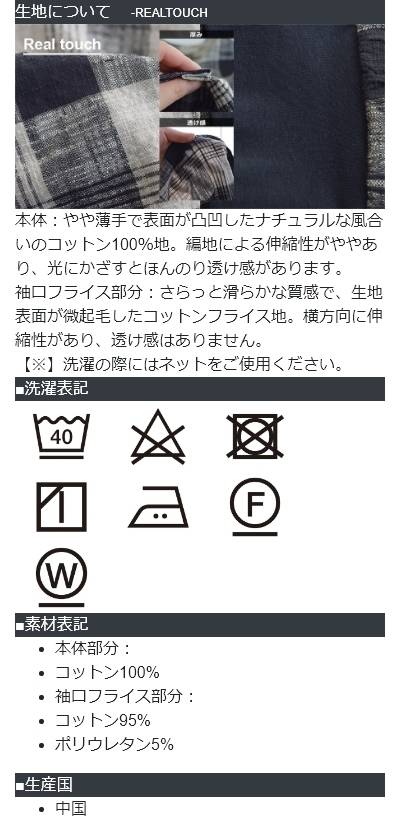 [素材]本体部分:コットン100% 袖口フライス部分:コットン95% ポリウレタン5%