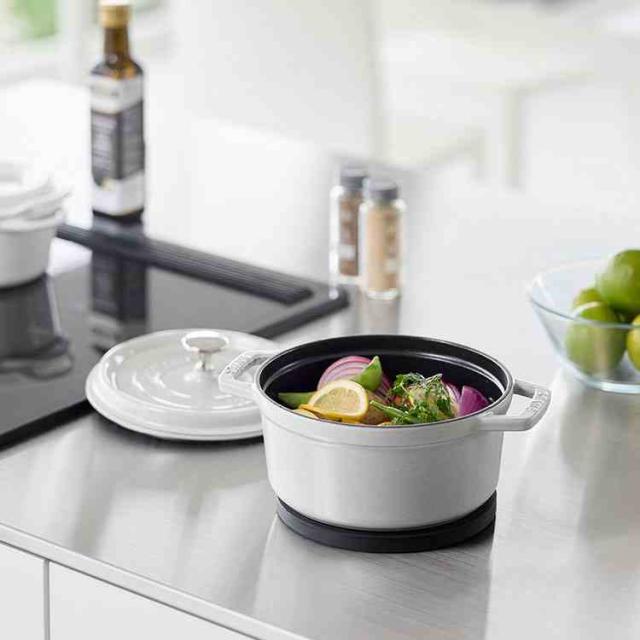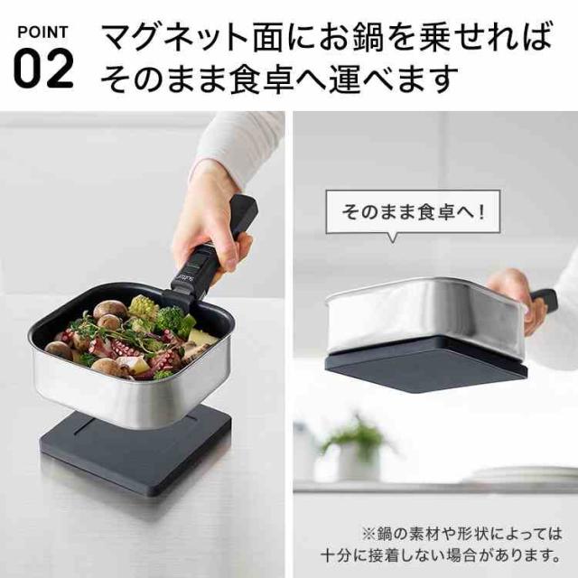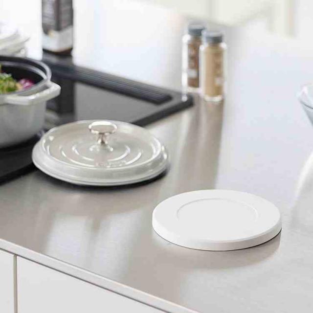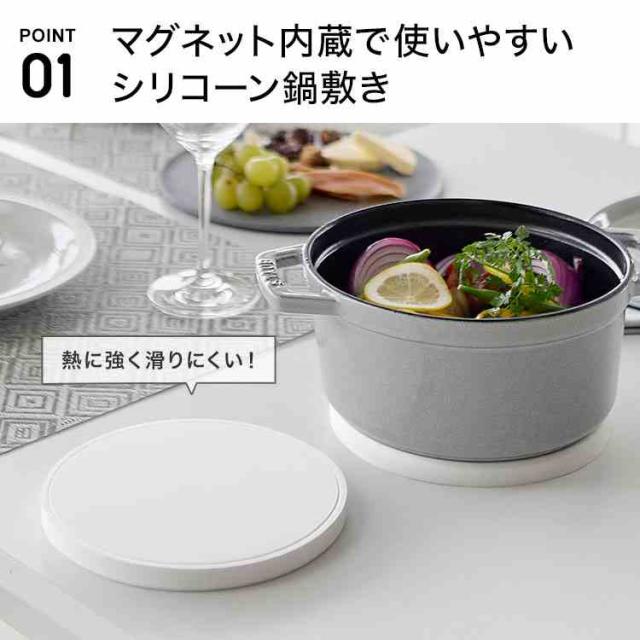 熱に強く、滑りにくい丸型のシリコーン製の鍋敷きです。マグネット内蔵のため、使わないときはスチール面に貼り付けてスッキリ収納できます。お鍋をマグネット面に載せて鍋敷きを付けたまま、そのまま食卓へ運べるので便利。※鍋の素材や形状、鍋底の凹凸によってはマグネットが十分に接着しない場合があります。