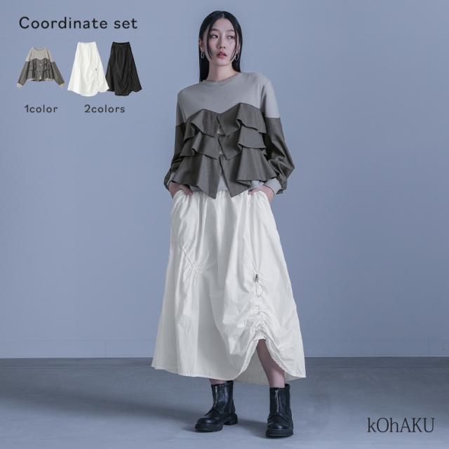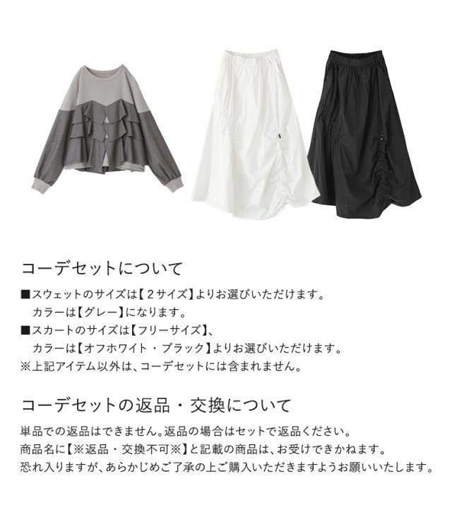 『異素材フリルドッキングスウェット×変形シャーリングデザインスカートコーデ2点SET』【メール便不可】【40】[2点コーデセット 2026 レディース スウェット トップス フリル ロングスカート ドローストリング ]
