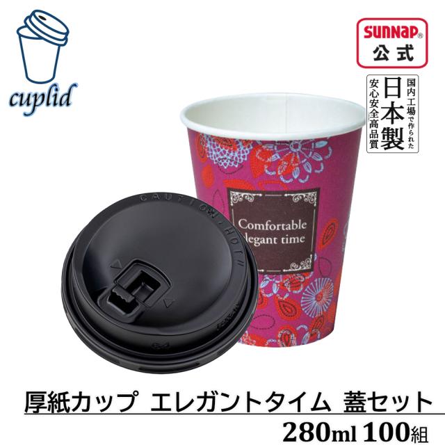 cuplid 厚紙カップ エレガントタイム 280ml リフトアップリッド 黒 100組【蓋付 ふた付き 使い捨て テイクアウト 持ち帰り 紙コップ ふたセット Mサイズ】