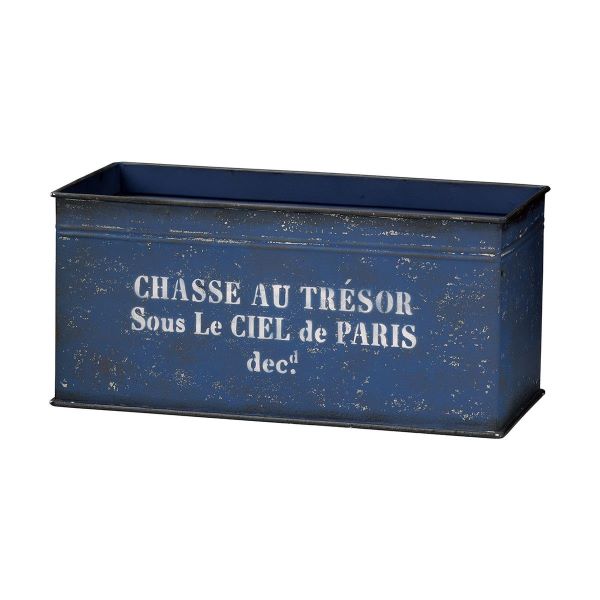 アンティーク調のデザインが魅力的なブリキプランターです。 深みのあるネイビーブルー色に、フランス語で「パリの空の下での宝探し」と書かれたこの缶は、 どこか懐かしさを感じさせるビジュアルが特徴です。 |