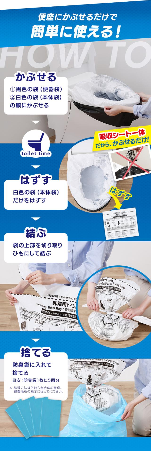 災害時や断水時などのトイレが使えない場面に加え、介護・アウトドアシーンでも役立つ非常用トイレ袋です。