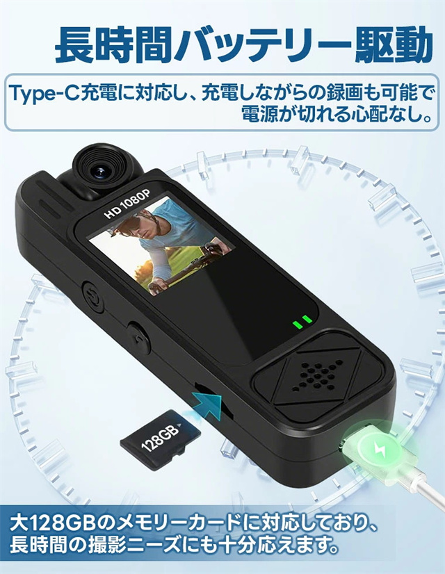 | 仕様 | ◆レンズ: 回転可能レンズ180度 ◆TFTディスプレイ: 1.3インチカラー表示240×240 ◆録画解像度: 1920×1080P/1280×720P/VGA ◆録画ファイル形式: AVI ◆写真画質: 1M/2M/3M/5M/8M/10M/12M ◆写真形式: JPG ◆ループ録画: オフ/3分/5分/10分 ◆ホワイトバランス: 自動/晴天/曇り/白熱灯/蛍光灯 ◆露出補正: 2/1/0/-1/-2 ◆動体検知: オン/オフ ◆音声録音機能: オン/オフ ◆タイムスタンプ: オン/オフ ◆キー音: オン/オフ ◆自動電源オフ: オフ/1分/3分 ◆対応言語: 英語/簡体字中国語/繁体字中国語/日本語/韓国語/ロシア語/フランス語/ドイツ語/チェコ語/ポルトガル語/ポーランド語/ オランダ語/トルコ語/タイ語/スペイン語 ◆交流周波数: 50Hz、60Hz ◆自動画面オフ: オフ/3分/5分/10分 ◆音量: オフ/0〜7 ◆録音ファイル形式: WAV ◆フォーマット: 確認、キャンセル ◆システムリセット: 確認、キャンセル ◆動作湿度: 30% ◆動作温度: -25度 〜 +75度 ◆電源供給: USB電圧5V、電流1A/バッテリー3.7V(バッテリーははんだ付けされており、取り外し不可) ◆バッテリー容量: 1200mAh ◆連続使用時間: 約5時間 ◆待機電流: シャットダウン時5.61mA ◆低電圧警告:3.53V ◆メモリーカード: TFカード、最大128G対応 |