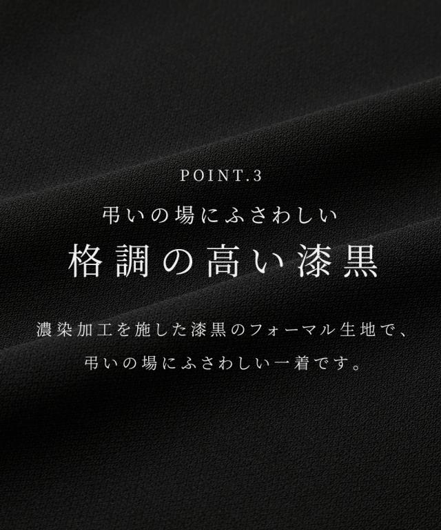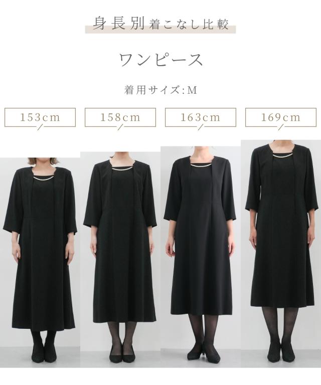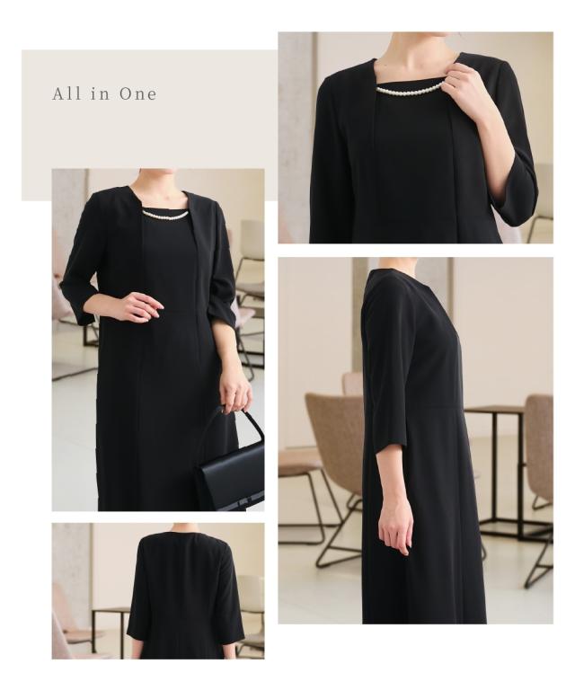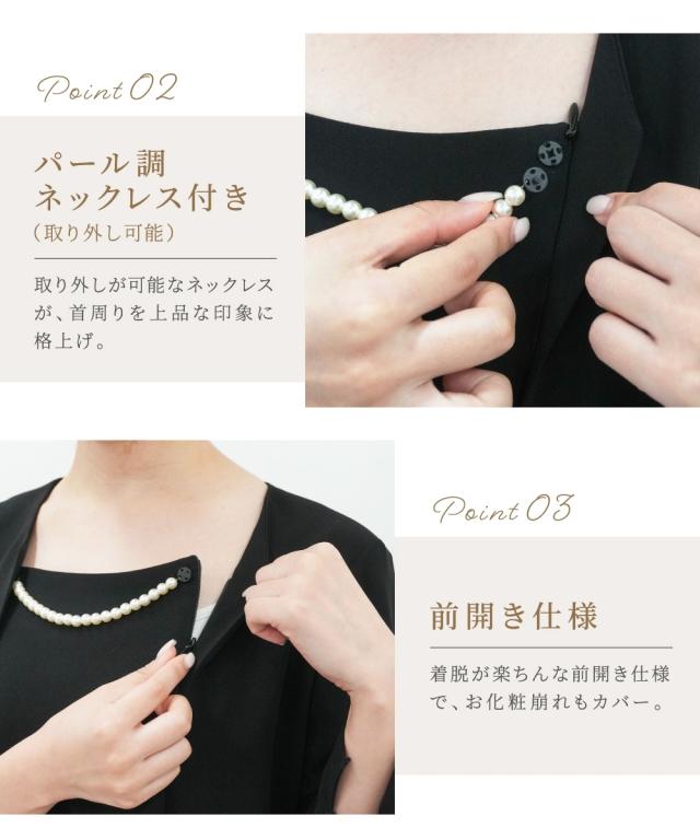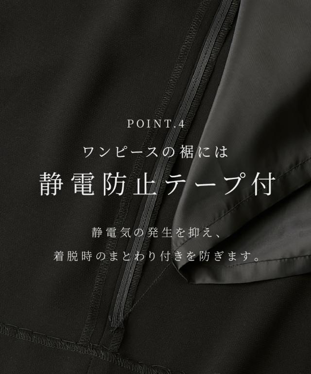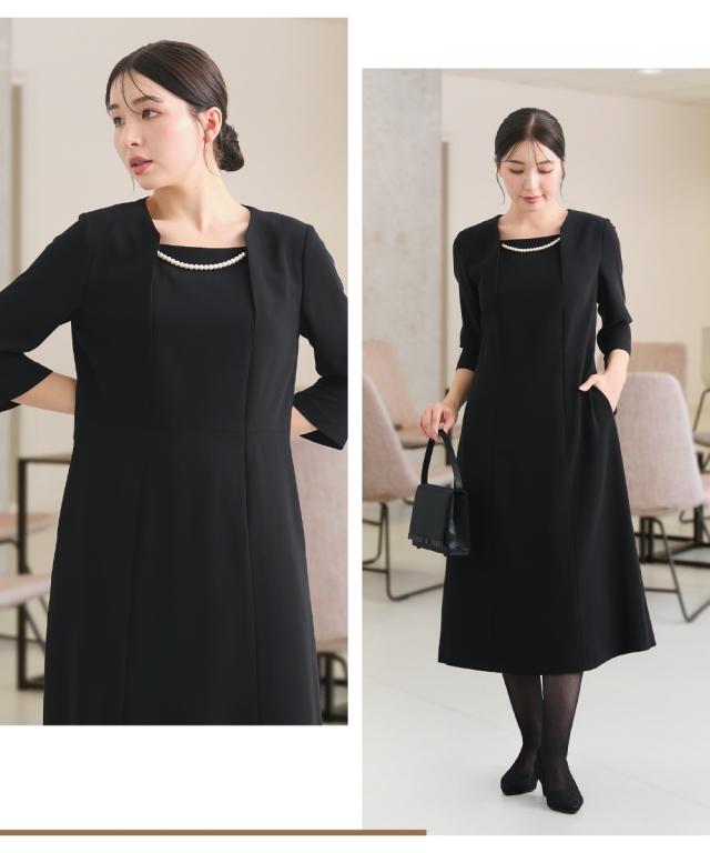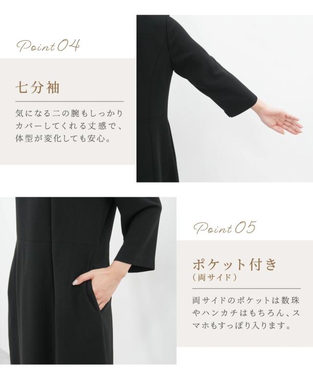 品のある格式高い装いを大切にする方へ 礼節に沿った気品のある姿を叶えてくれる王道ブラックフォーマル こだわりポイント 大人の気品と快適さを両立した、上質なブラックフォーマルワンピース(喪服・礼服) ワンピースの身頃には軽やかな生地を使用し、動くたびに美しく揺れるシルエットが魅力です 前開き仕様で、着脱がスムーズ。ヘアセットやメイクを崩さずにお召しいただけます 取り外し可能なパール調ネックレスが、首回りを上品な印象に格上げ 防しわ加工で、長時間の着用や持ち運びにも安心 洗濯機で洗える(ネット使用)ウォッシャブル仕様で、いつでも清潔に保てます 静電気防止シール付きで、着脱時のまとわり付を防ぎます 深みのある漆黒のフォーマル生地を使用し、格式ある式典にもふさわしい落ち着いた印象に 体型カバーポイント 気になる二の腕やウエスト、膝見えをしっかりカバーし、上品なシルエットに ワンピースはふらしデザインで、お腹まわりをふんわりカモフラージュ ミディ丈で膝下まできれいに隠れ、安心感のある着丈です 前開き仕様で着脱も簡単、忙しい朝や急なお呼ばれにも対応できます 対応着用シーン 【お通夜】【葬儀】【告別式】【結婚式】【お食事会】【お呼ば
