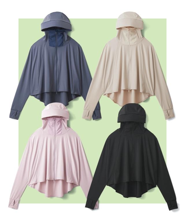 ■デザイン:機能性を第一に考えたこだわりの設計が随所に光ります。顔周りをすっぽり覆うフードには、日差しを遮る深めのつばを装備。さらに、顔の下半分を隠せるメッシュ素材の切り替えを施すことで、通気性を確保しながら鼻先までしっかりガードし、息苦しさを軽減しました。体型カバーにも優れたゆったりとしたポンチョタイプは、身体のラインを拾わず、気になる腰回りや二の腕を自然に目隠ししてくれます。裾は前後差をつけたデザインで、後ろ姿もスッキリとした印象に。自転車のハンド