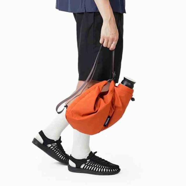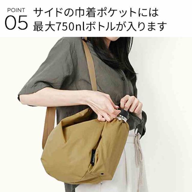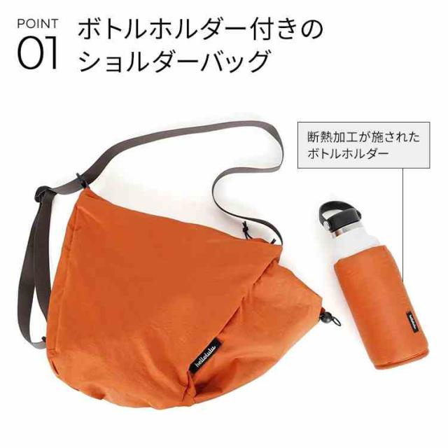 環境に優しいリサイクル素材から作られた、ボトルホルダー付きのショルダーバッグです。サイドに巾着式のポケットが付いており、最大750mlのボトルを収納することができます。断熱加工が施されたボトルホルダー付きで、飲み物の温度を長時間保ちながらボトルを傷から守ります。ストラップの使い方次第で、2通りのショルダーバッグとしてやハンドバッグとしても使える多機能バッグです。