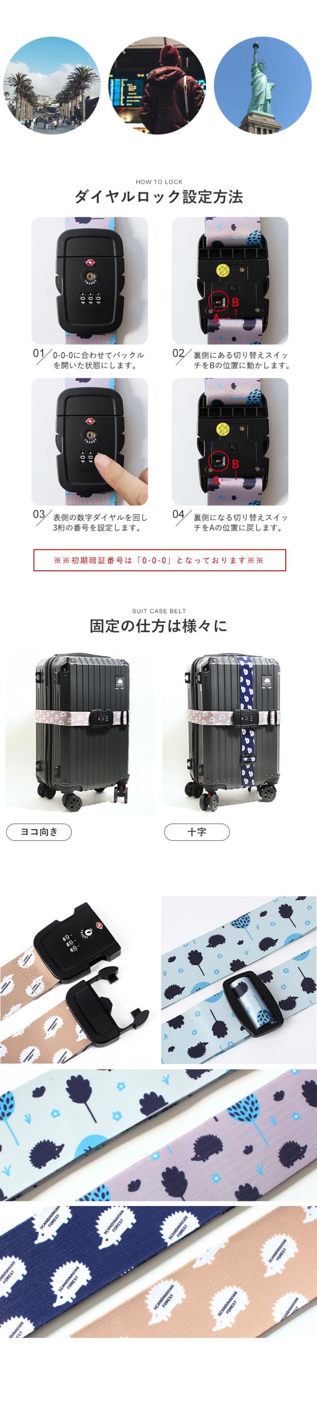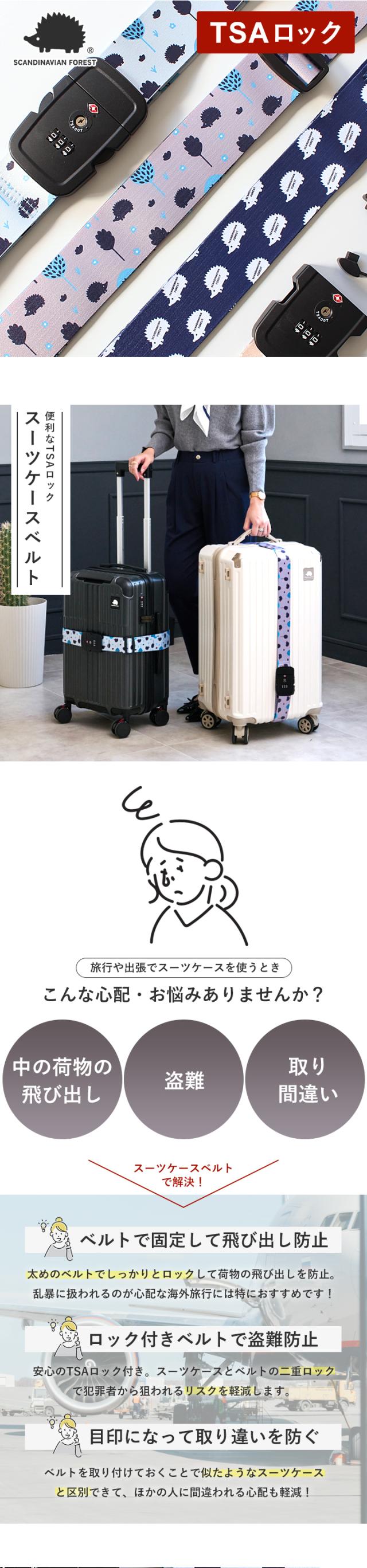TSAロックのスーツケースベルト!登場 スカンジナビアンフォレストのトレンドマーク ハリネズミの柄が可愛い4タイプから選べる! 中の荷物の飛び出し防止・盗難防止 取り間違いの防止などスーツケース 使用時に気になるあれこれを解決! ハワイやグアムなどアメリカ領への 旅行に便利なTSAロックを搭載で 施錠したままでも荷物を預けられます。 |
