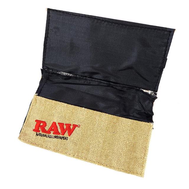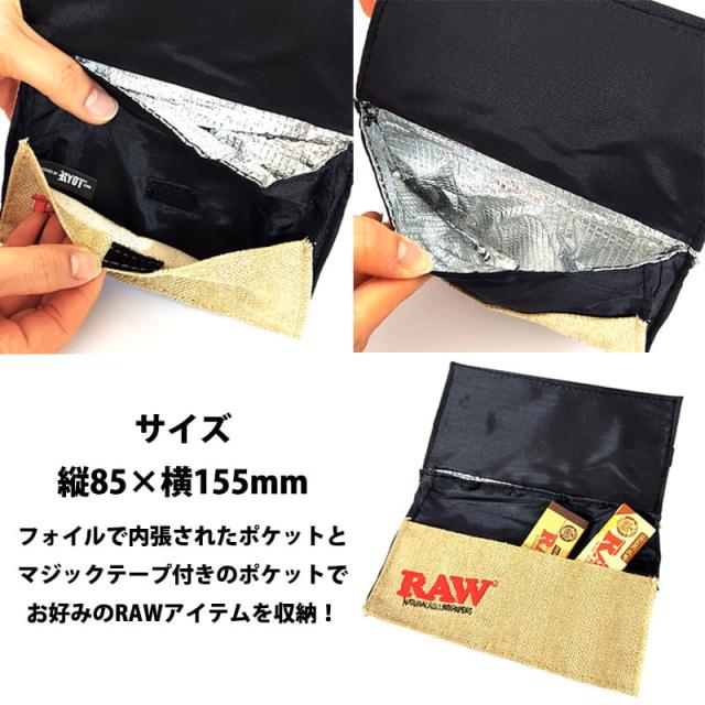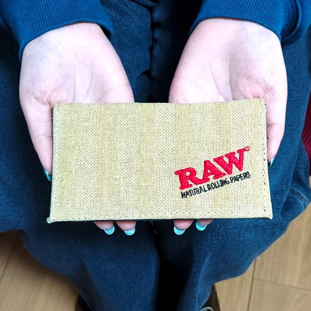 ジュート素材にRAWのロゴが刺繍されたナチュラルなデザインの手巻きタバコ用ポーチです。