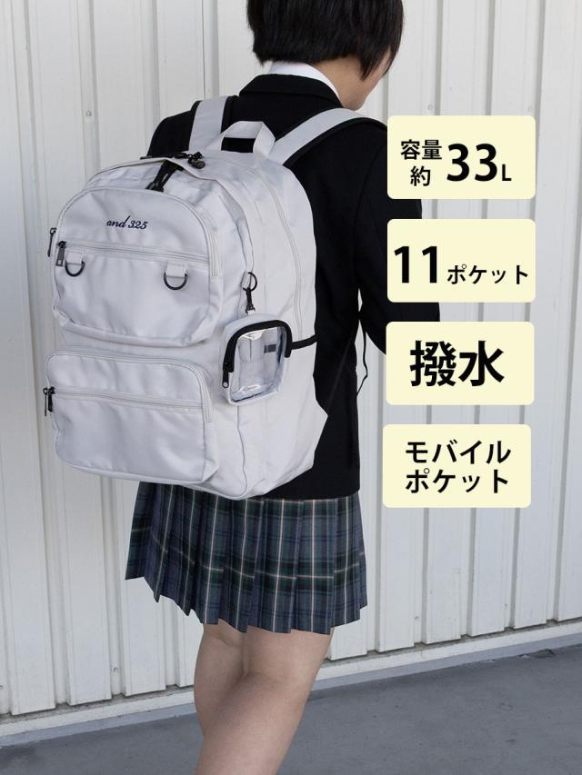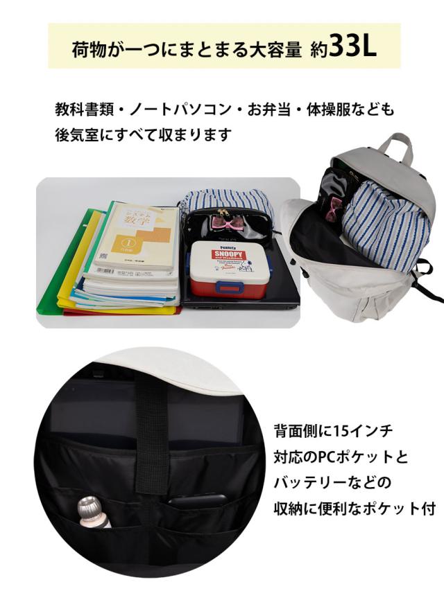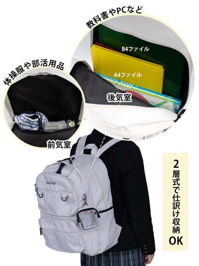大容量約33Lのユニセックスデザインのコストパフィーマンスに優れた2層式のスクールリュックです。撥水加工を施したカラビナでぶら下げるクリアポーチ付き。ワイヤレスイヤホンやリップなど小物を見せ収納できます。