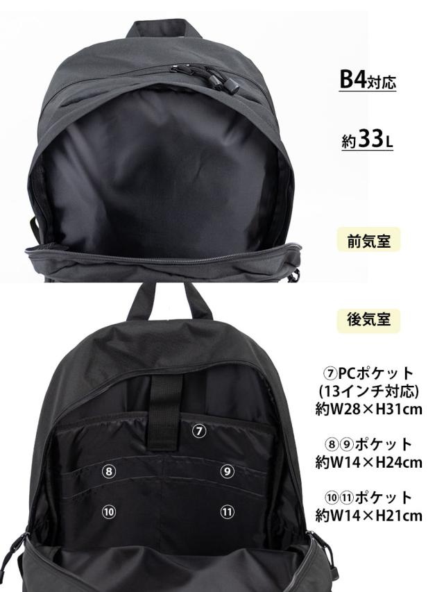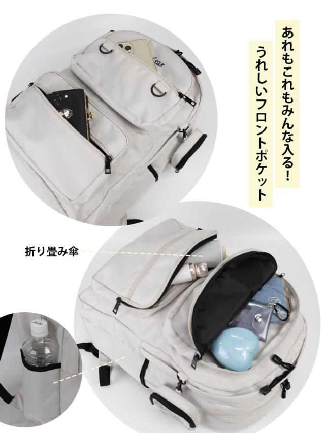 ■大容量約33Lのユニセックスデザインのコストパフィーマンスに優れた2層式のスクールリュックです。撥水加工を施したカラビナでぶら下げるクリアポーチ付き。ワイヤレスイヤホンやリップなど小物を見せ収納できます。 ■11ポケットで小物をきっちりと収納でき、本体は2層に分かれています。B4サイズ対応、15インチPC対応ポケット付きです。 |