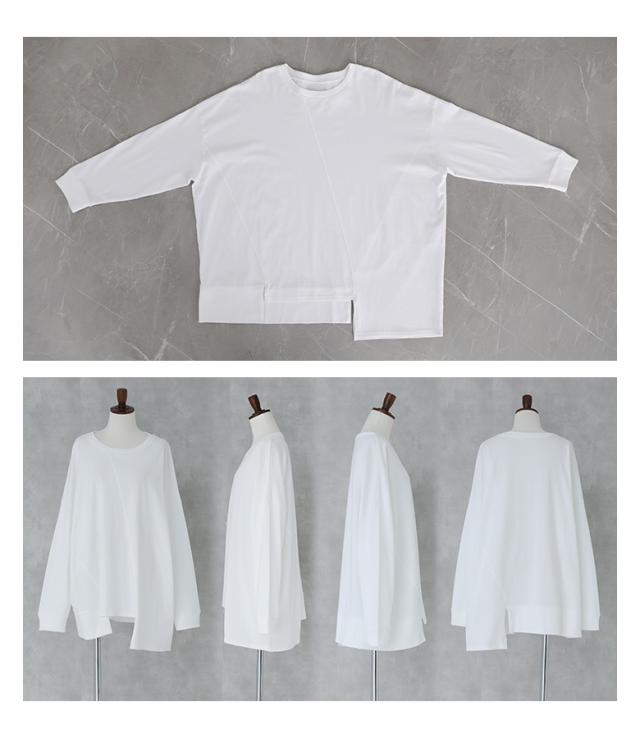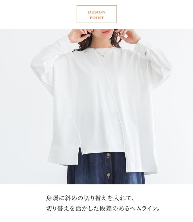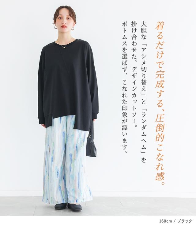 <春新作>『アシメ切替ランダムヘムカットソー』【メール便不可】【20】[カットソー 長袖 レディース トップス ロンT 綿100% クルーネック アシンメトリー アシメ ランダムヘム お尻が隠れる 春 秋]