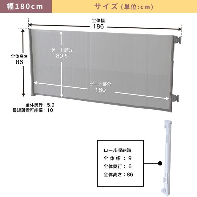 ベビーゲート ペットゲート ロール式 幅180cm 伸縮式 ロック機能付き フロアフック付き メッシュタイプ 伸縮 簡単設置 階段用 ベビーフェンス 柵 ゲート 室内赤ちゃん ペット 安全対策 侵入防止 リビング キッチン 跨ぎ防止 ロール ワイド ピレア180 ドリス