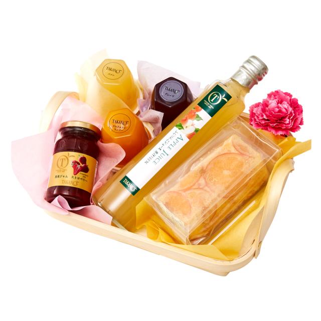 | 内容量 | オレンジケイク、ふじりんごジュース350ml、果実ジャム150g(ストロベリー)×各1、果実ゼリー(グレープ、パイン、アルフォンソマンゴー×各1)、カーネーション(造花)×1(篭入) |