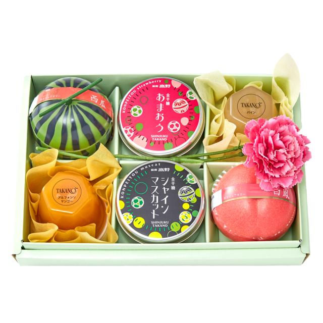 | 内容量 | 果実ピュアゼリー(西瓜、白鳳×各1)、フルーツ金平糖35g(シャインマスカット、あまおう×各1)、果実ゼリー(アルフォンソマンゴー、パイン×各1)、カーネーション(造花)×1 |