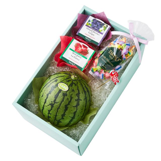 | 内容量 | 小玉西瓜(熊本県、茨城県または群馬県産)×1、フルーツチョコレートSPリボン80g(個包装紙込み)×1、クリスタルデュオ(ミックスベリー&グレープゼリー、ストロベリープリン&ラ・フランスゼリー×各1)、鯉のぼりピック(ちりめん素材使用)×1 |