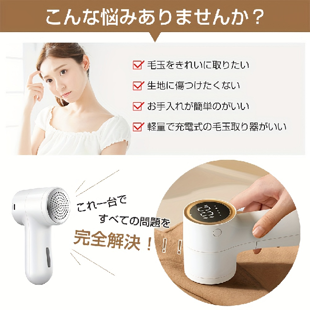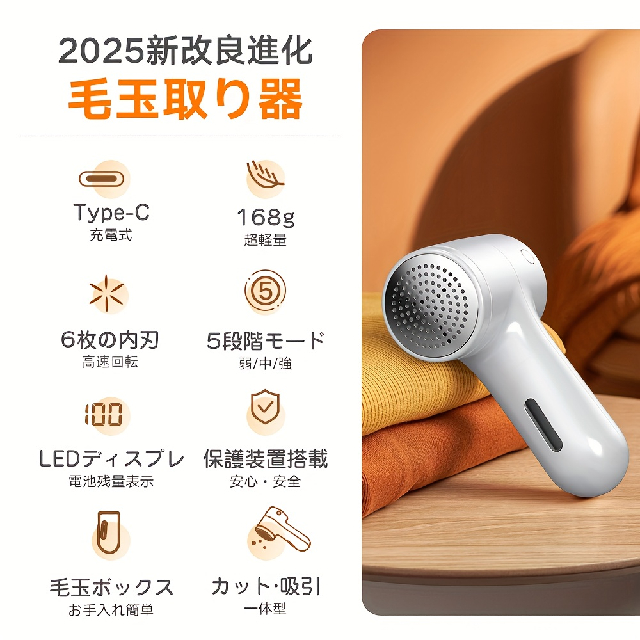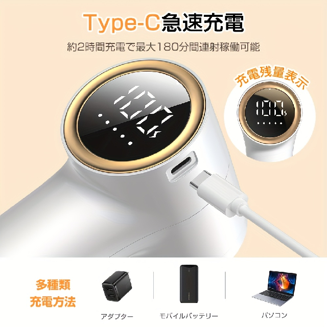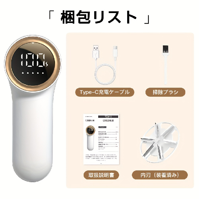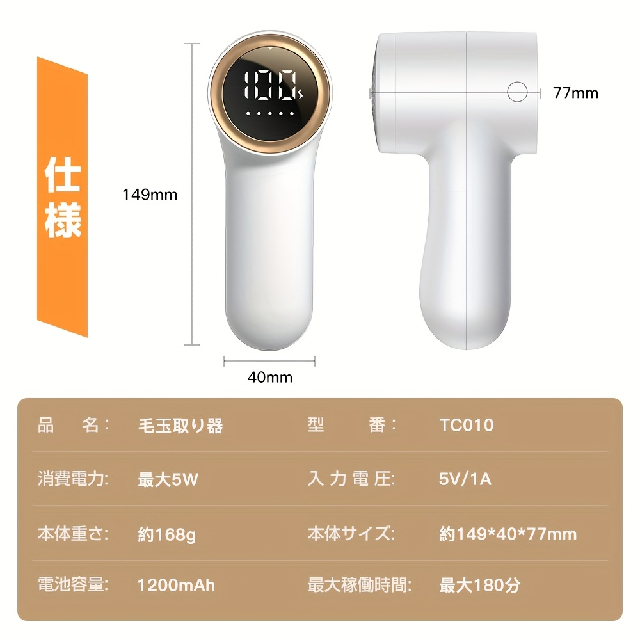 製品名:毛玉取り器 型番:TC010消費電力:最大 5W内蔵バッテリー容量:1200mAh満充電時最長稼働時間:約 180 分重量:約 168gサイズ:約149*40*77mm製品特長5 段階調整機能安全保護装置付き大型 LED ディスプレイ大容量ダストボックス関連キーワード毛玉取り器、毛玉処理、コードレス、ホワイト、毛玉クリーナー、毛玉処理機、超軽量、替え刃付き、USB 充電、LED ディスプレイ、デジタルディスプレイ、コンパクト、3 段式、除毛器、電動、電動毛玉取り器、コンセント、生地傷み防止、持ちやすい、ポータブル