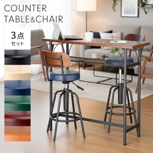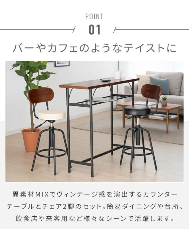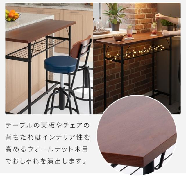 カウンターテーブル 3点セット カウンターチェア 2脚 テーブル 昇降式 回転式 背もたれ付き 固定脚 キャスターなし バーチェア ハイチェア ウォールナット 木目 レザー調 カフェ バー キッチン カウンター 飲食店 ダイニング